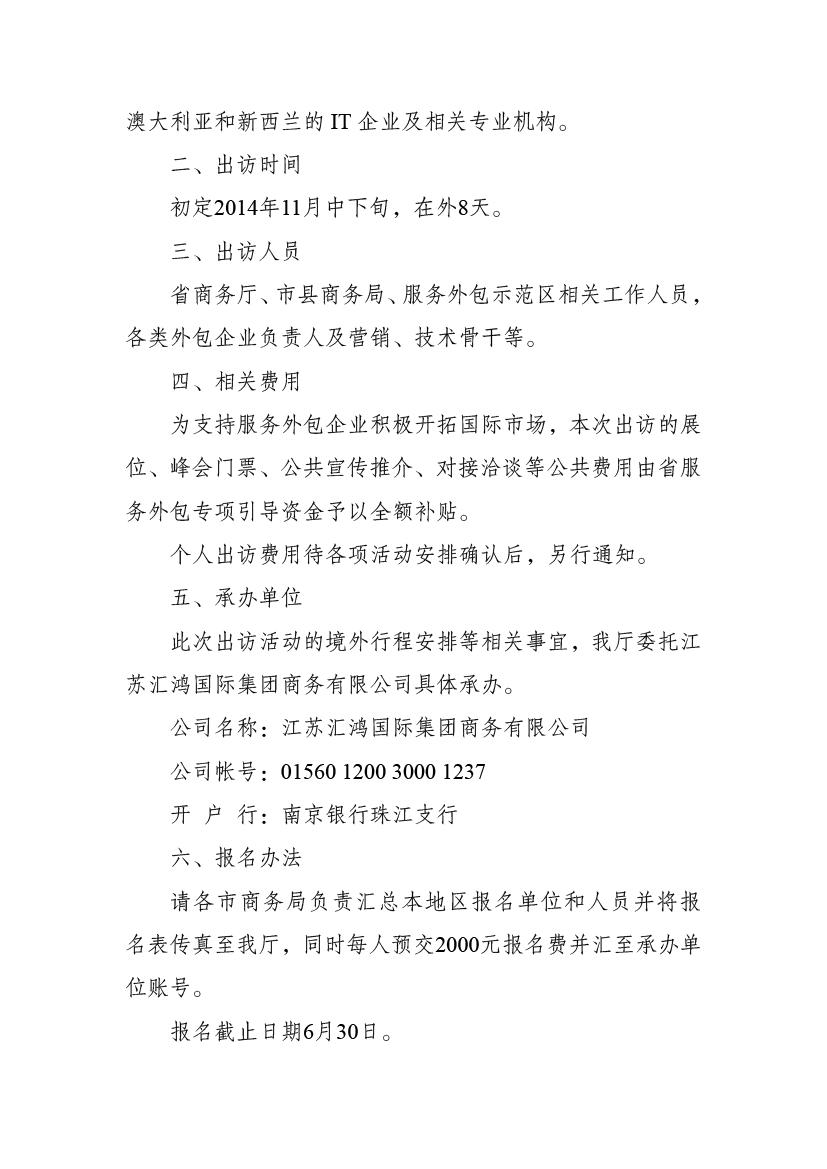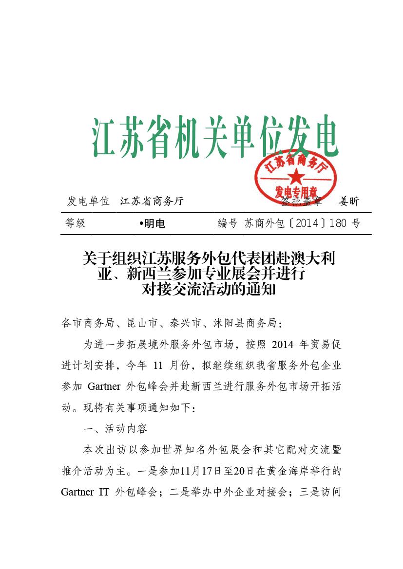 關(guān)于組織江蘇服務(wù)外包代表團赴澳大利亞、新西蘭參加專業(yè)展會并進行對接交流活動的通知