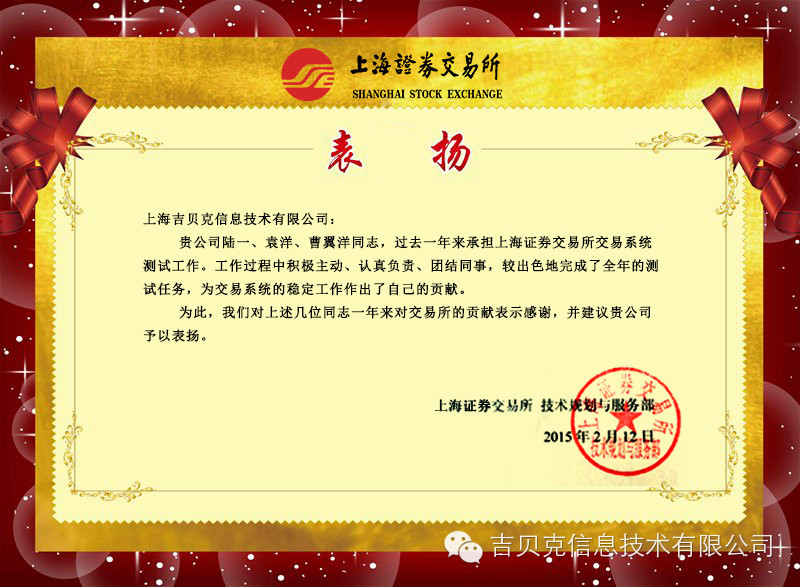 近日,吉貝克喜獲上海證券交易所的表揚信。上證所高度肯定了吉貝克團隊的工作成績。吉貝克在2014年承擔上證所的交易系統(tǒng)測試工作,以嫻熟的技術(shù)、優(yōu)質(zhì)的服務(wù)為前提,以為客戶創(chuàng)造最高價值為己任,嚴把產(chǎn)品質(zhì)量,為交易系統(tǒng)的穩(wěn)定運行做出了突出的貢獻。信中特別點名表揚了我司陸一、袁洋、曹翼翔同志,稱贊這三位同事積極主動、認真負責、團結(jié)同事。